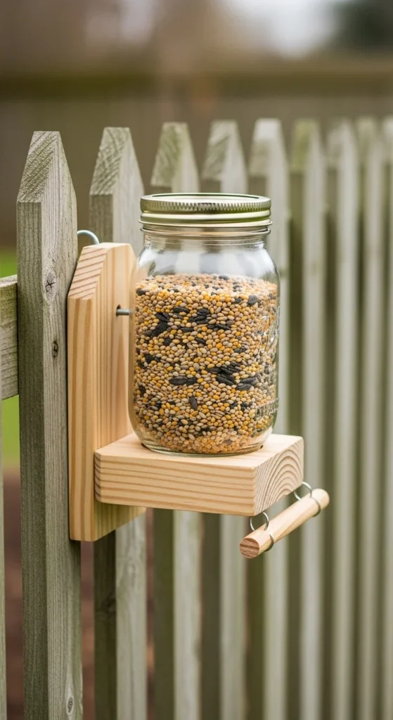 Attach a mason jar horizontally to a small wooden board. Fill it with seed, and birds can perch on the edge to eat. It’s sturdy, rustic, and lasts through seasons with minimal upkeep.