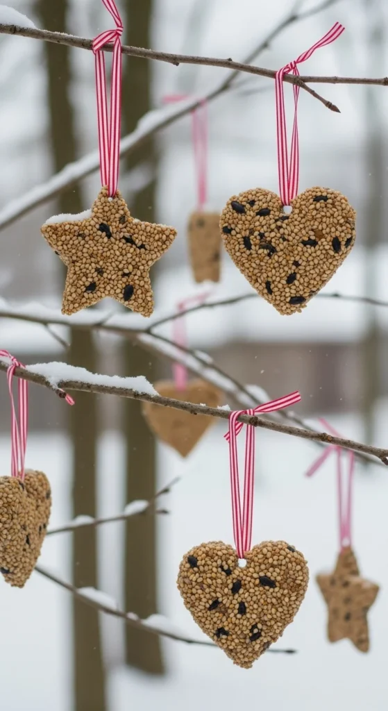 Mix gelatin with birdseed, pour it into metal cookie cutters, and add twine before it sets. Once hardened, hang them outside. They make adorable holiday decorations that double as snacks for birds.