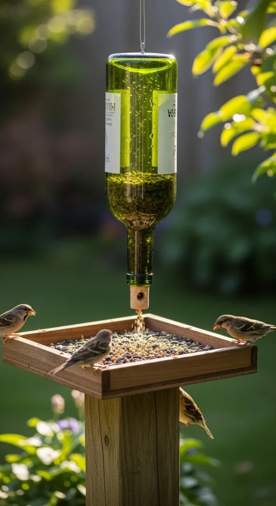 Mount an inverted wine bottle over a small feeding tray. As birds eat, more seed trickles down. It’s elegant and practical, perfect for garden décor. Use clear bottles to see when it’s time to refill.