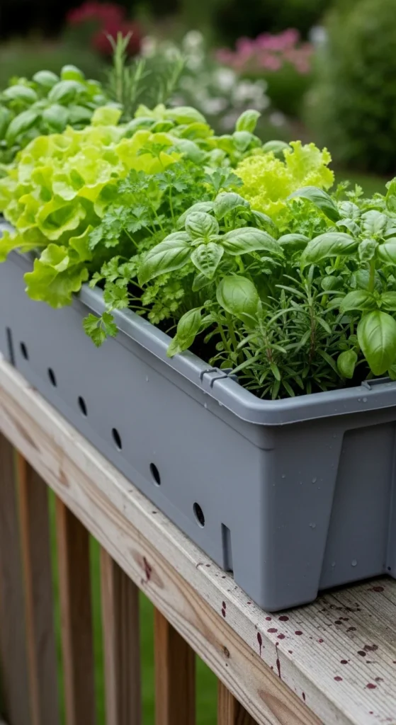 A storage tote turns into a mini raised bed for greens. Choose a low, wide tote so you get more surface area. Drill many drainage holes across the bottom. Don’t be shy. Greens hate soggy soil.
