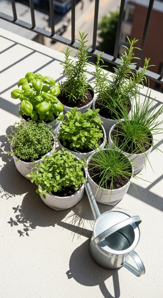 Small grow bags are light and easy. Arrange them in a ring so you can water quickly. Group herbs with similar water habits together.