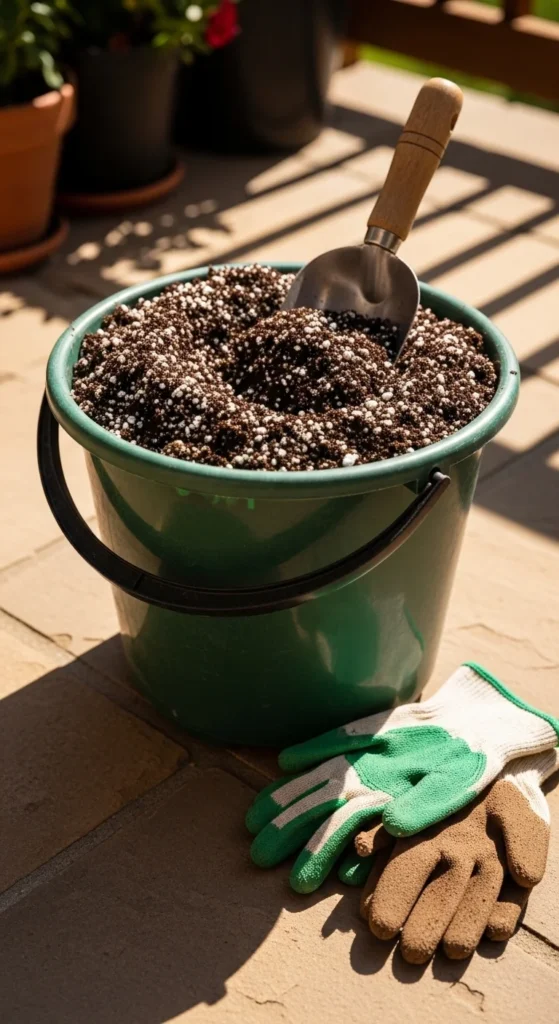 Set up a simple soil mixing station. Mix potting mix with compost and perlite for airflow. Keep extra mix in a sealed tote.