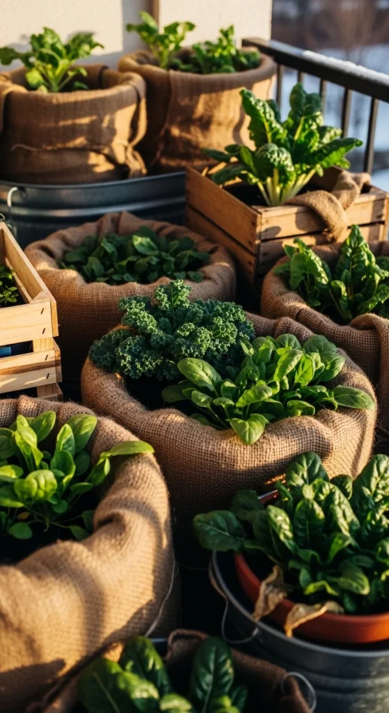 Budget tip: reuse cardboard between pots as a wind break. Grow greens like spinach and lettuce for cool-season harvests.