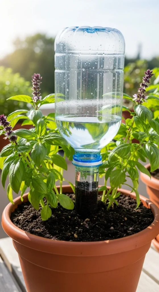 If you forget to water, a bottle reservoir can help. Take a plastic bottle, poke a tiny hole in the cap, fill with water, and invert it into the soil. The water releases slowly as the soil dries.