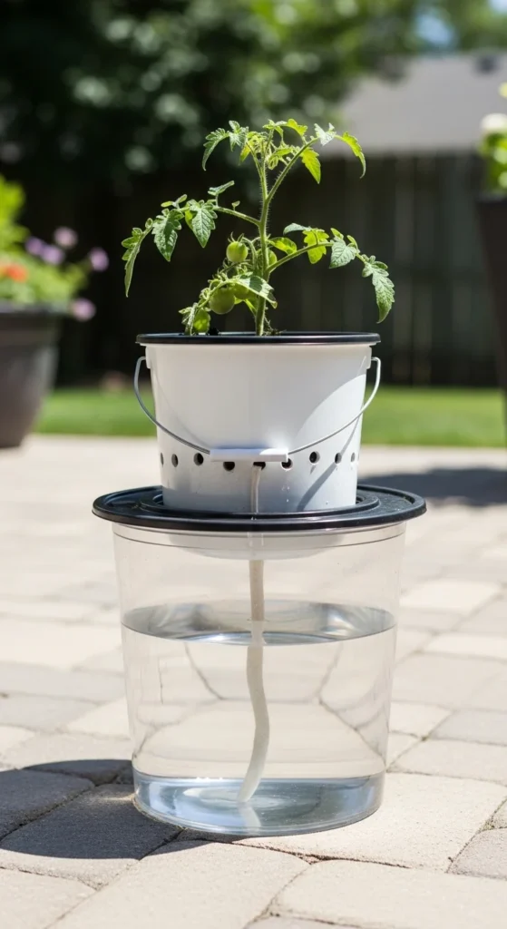 Drill drainage holes in the top bucket’s bottom. Add a cotton rope wick through one hole so it hangs into the water reservoir. Fill the top bucket with potting mix. Plant a compact tomato or pepper if you have enough sun.