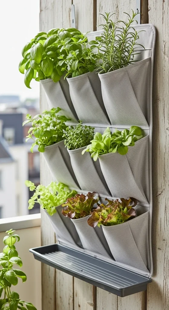 A hanging organizer can become a vertical garden. Use pockets for herbs and shallow-root greens. Add a plastic liner inside each pocket to protect fabric and hold soil. Keep drainage in mind. Excess water must drip out.