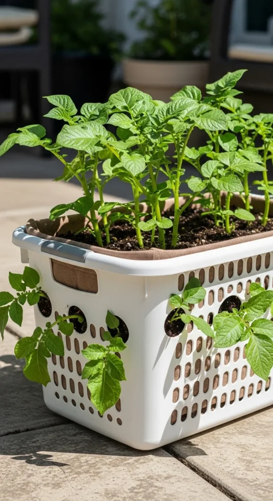 A laundry basket can grow potatoes because it’s tall and breathable. Line it with landscape fabric so soil stays inside. Drill extra holes in the bottom if needed.