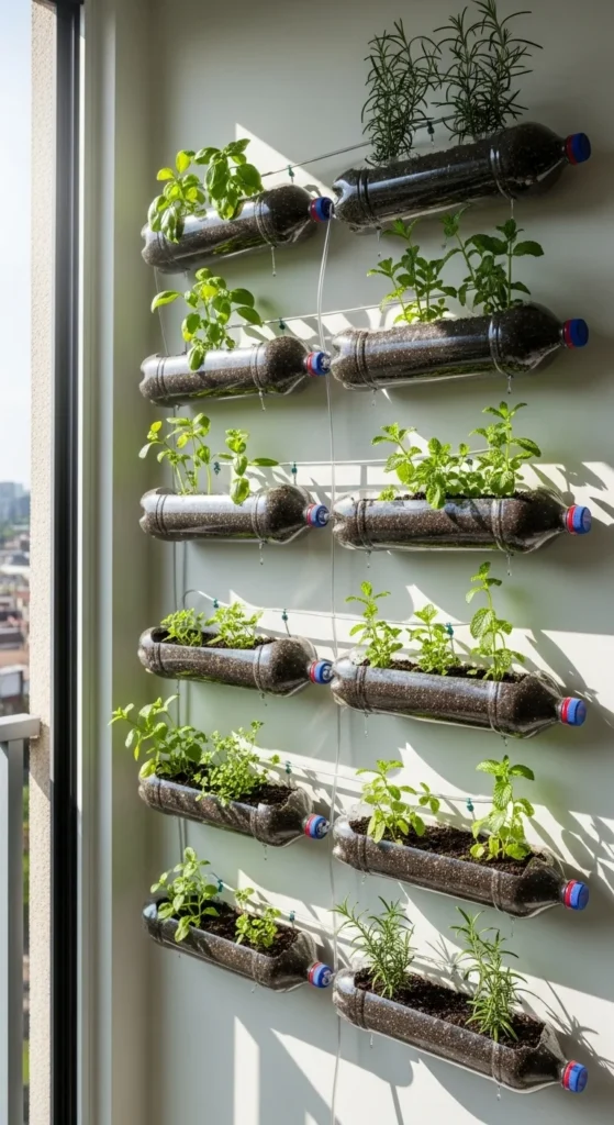 Reuse plastic bottles as planters. Hang them in rows.