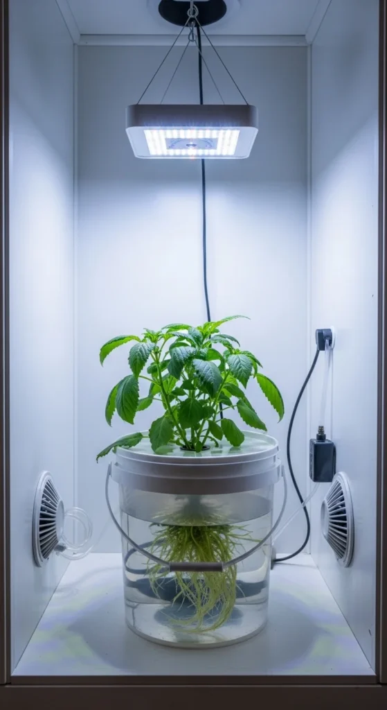 Fill the bucket with water and mix hydro nutrients slowly, one part at a time. Aim for pH 5.5–6.5. Add an air stone connected to a basic air pump. This keeps roots surrounded by oxygen.