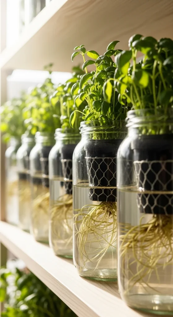 Glass jars work well for herbs. Add nutrient solution and a net cup lid. Cover jars to block light.