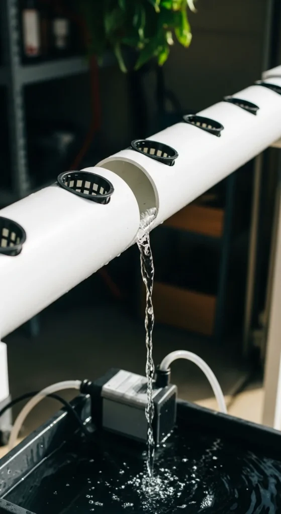 Nutrient Film Technique uses a thin stream of water flowing past roots. PVC pipes make great channels.