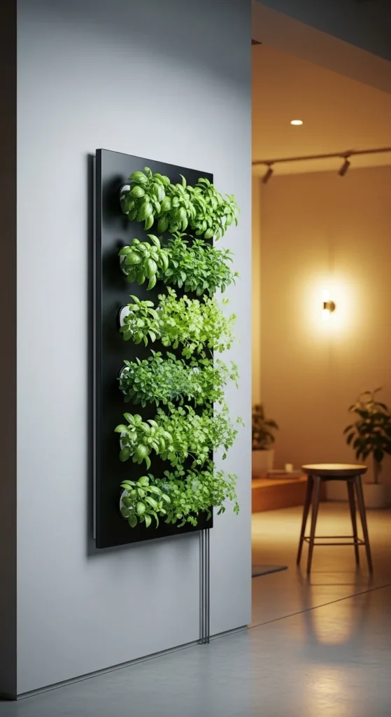 Vertical towers save space. Water drips from the top and flows down.