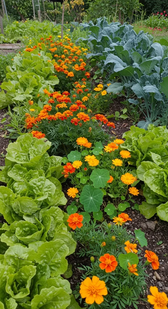 Edible flowers add color and flavor. Nasturtiums, marigolds, and calendula brighten beds and salads. Plant them with vegetables to attract pollinators while decorating your meals.