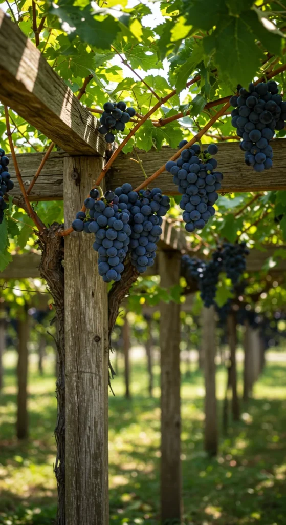 Grapevines bring shade and food. Train them over arbors or pergolas for natural cover. Grapes can be eaten fresh, made into juice, or dried as raisins.