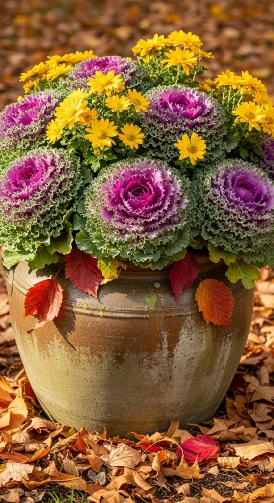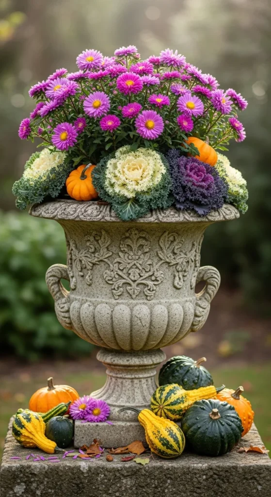 Stone containers retain warmth, protecting roots from cold. Combine asters for color and kale for texture. Add small gourds for decoration. It’s elegant yet simple for any outdoor spot.