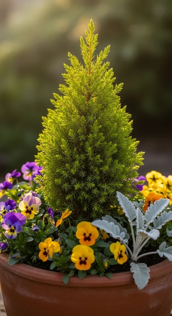 Evergreens anchor a fall container beautifully. Place a small juniper in the middle and fill the base with hardy flowers. It adds height and guarantees greenery long after frost hits.