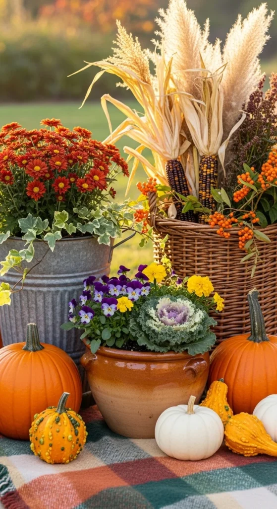 Group planters in threes for a fuller look. Mix container sizes and materials for variety. Choose hardy plants like kale, pansies, and grasses. It’s an affordable way to fill space and create cozy autumn charm.