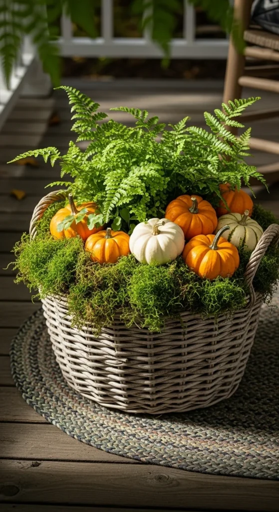 For shaded spaces, try hardy ferns. Line a basket with moss, add soil, and fill with ferns and miniature pumpkins. Mist occasionally to keep them lush. It’s earthy, soft, and budget-friendly.