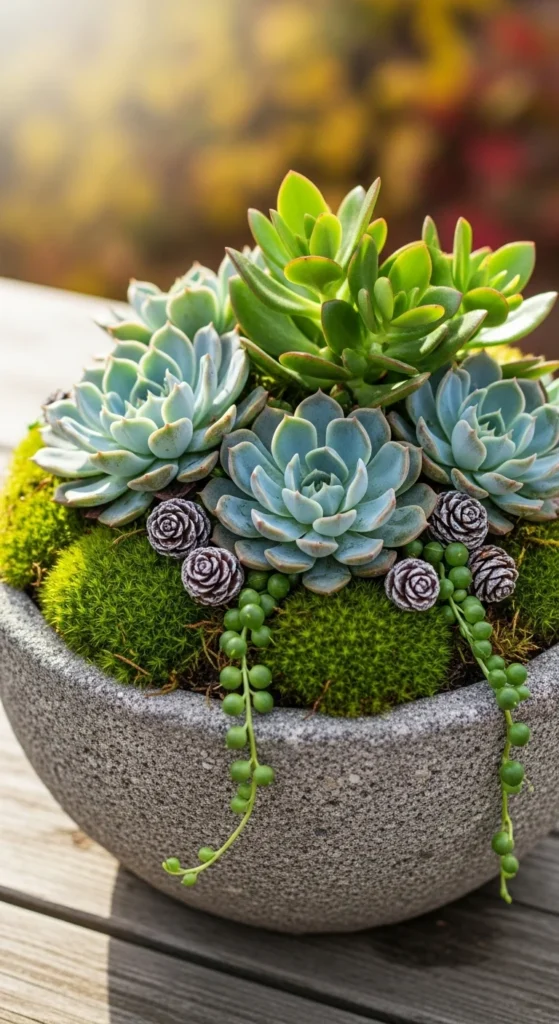 Succulents like hens-and-chicks can tolerate light frost. Plant them in stone or concrete pots with moss for texture. Add small pinecones for a natural accent. They’re durable and require little care.