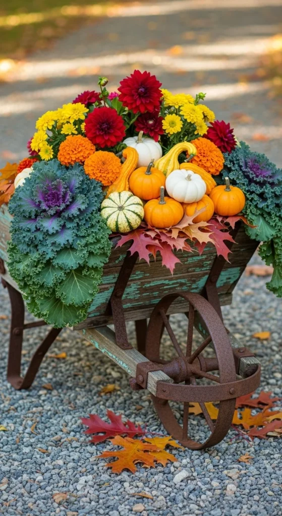 Turn an old wheelbarrow into a mobile fall garden. Line it with soil and add mixed plants—mums, kale, and small pumpkins. It’s easy to move and gives your yard an old-fashioned harvest charm.