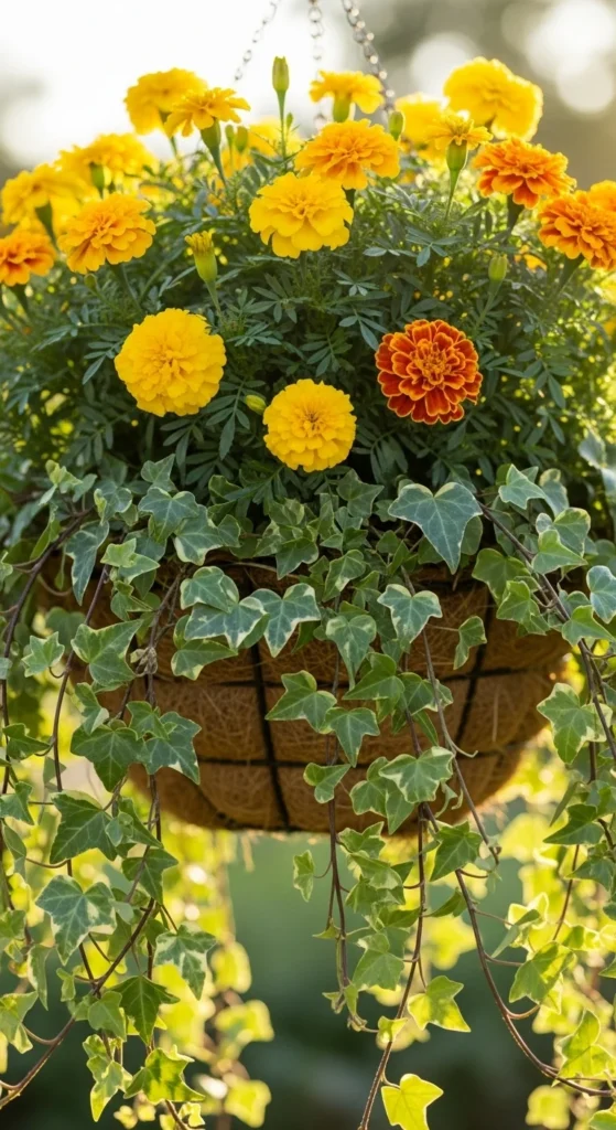 Mix trailing ivy with marigolds for hanging baskets that last through frost. The contrast of green and gold adds warmth. Hang near a doorway for an inviting splash of color.
