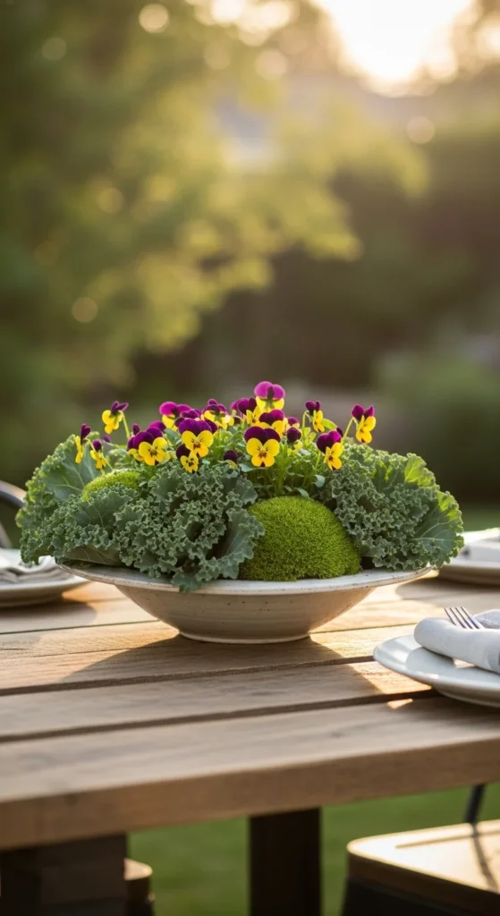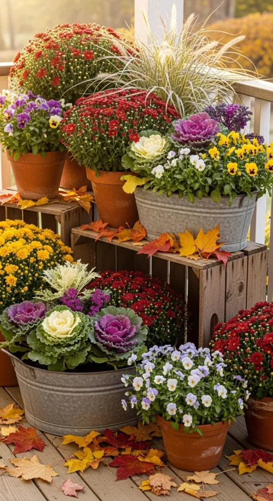 Pansies thrive in chilly weather and bounce back after frost. Mix colors—purple, yellow, and white—for cheerful contrast. They’re affordable and available everywhere in fall. Use smaller pots for easy rearranging when temperatures change.