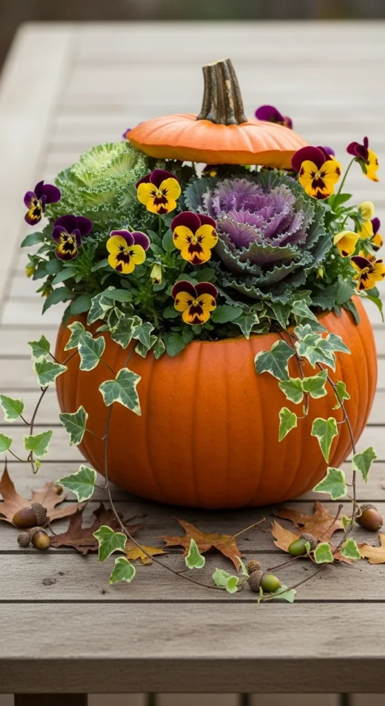 Turn a pumpkin into a temporary fall planter. Scoop it out, drill a small drainage hole, and fill it with soil. Add frost-tolerant plants like pansies and kale. When it softens later, compost the whole thing. It’s a quick, charming idea for porches and tabletops.