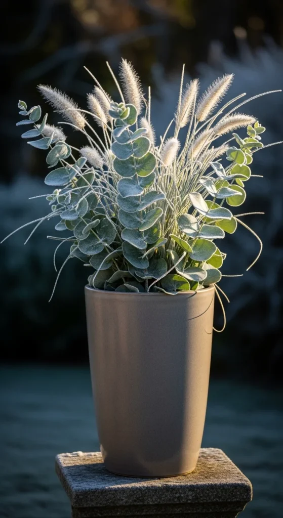 Pair eucalyptus with feather grass for a soft, textured display. The silver-green leaves shimmer under frost, giving your porch a peaceful, natural look that lasts into early winter.