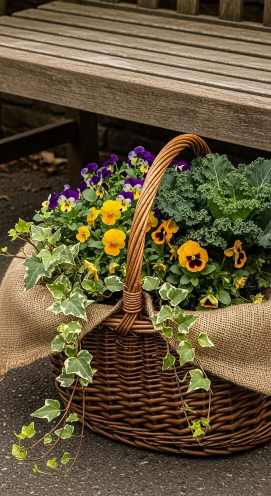 Use an old basket or crate to make a quick fall container. Line with burlap, add soil, and mix hardy plants. It’s easy to build, affordable, and charming beside entryways or patios.