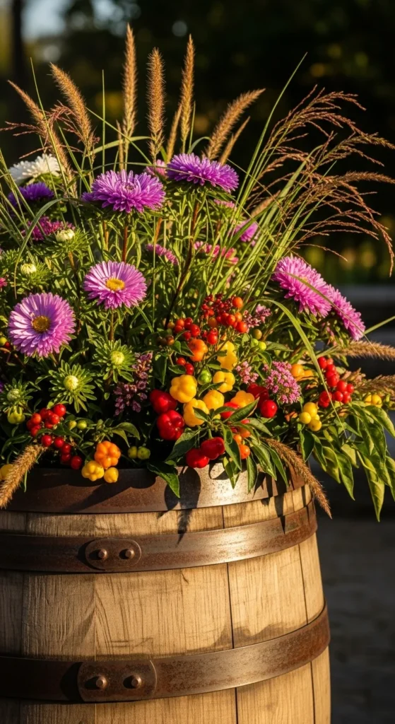 Repurpose a half whiskey barrel into a large fall display. Combine asters, ornamental peppers, and tall grasses for texture. The wood keeps roots insulated, helping plants stay happy after the first frost. Place it by your entryway for a bold seasonal statement.