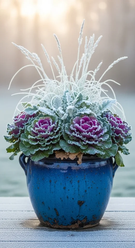 Ornamental cabbages handle cold weather beautifully. Use them in clusters for color variety. They look decorative and thrive in chilly air. Water lightly and they’ll last deep into winter.