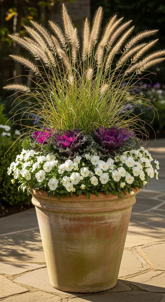 Grasses bring structure and movement to fall containers. Plant fountain grass in the center, then add pansies or kale at the edges. As frost hits, the grass turns golden, creating a soft autumn glow. It’s low-effort and long-lasting.