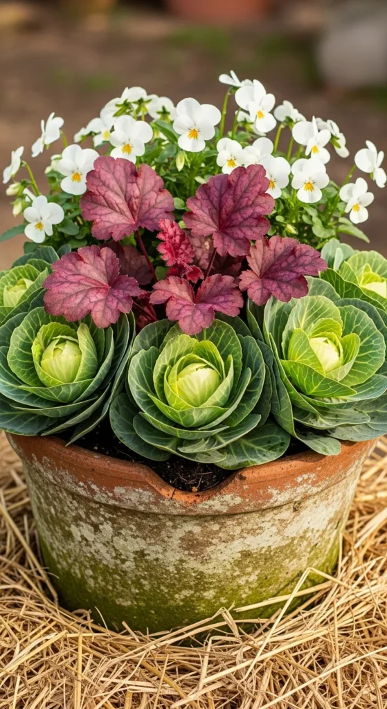 Heuchera adds dramatic foliage that matches fall’s earthy tones. Pair it with ornamental cabbage for contrast. These two thrive in cold weather and give your container rich texture without much upkeep.