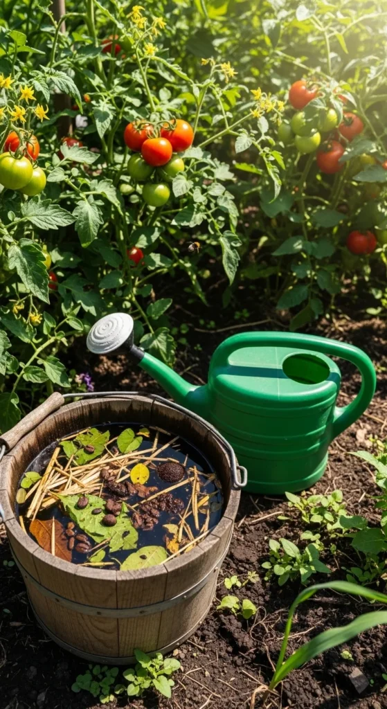 - Fill a bucket with compost and water (1 part compost to 5 parts water).