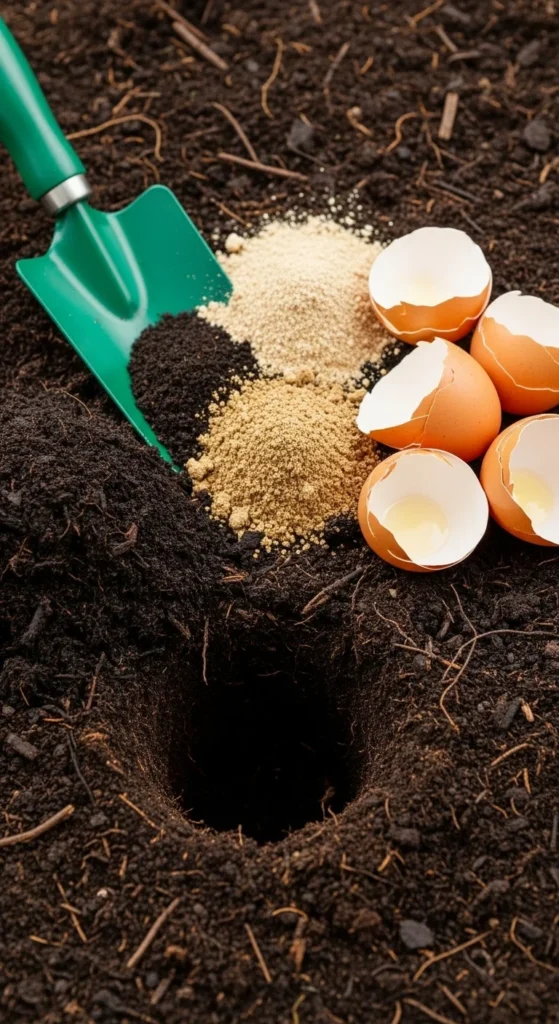 - At planting: Compost + bone meal + eggshells