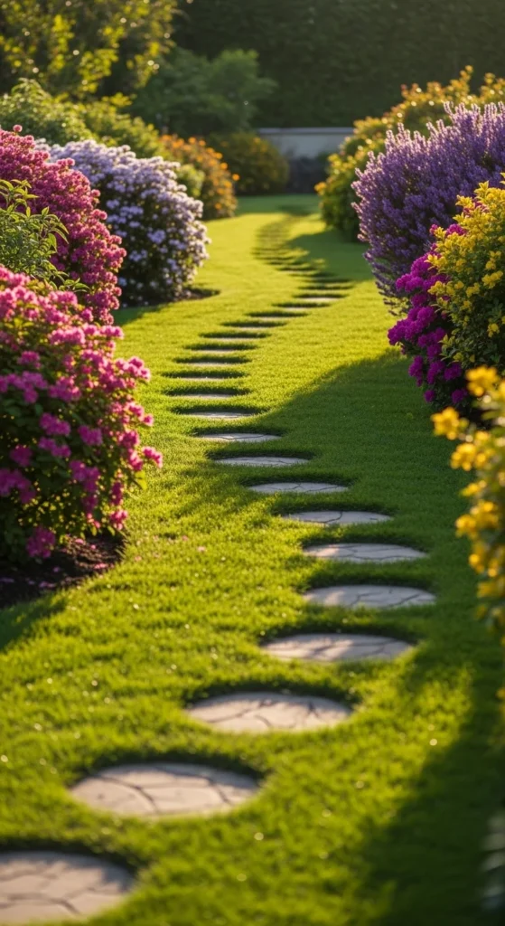 Curved stone paths instantly make gardens feel inviting. Use natural flagstones or stepping stones to form gentle turns that guide the eye across your yard. Add small groundcovers between stones for a soft, natural look. Surround the path with colorful perennials or low shrubs for charm. This simple feature adds movement and structure without major expense. It’s a quick DIY that transforms flat lawns into guided journeys through nature.