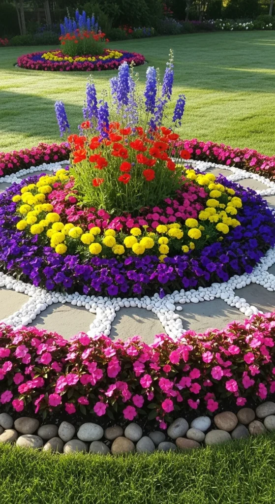 A flower island breaks up empty lawns beautifully. Choose a round or oval shape, and fill it with colorful blooms. Add a centerpiece plant like a small tree or ornamental grass. Use stone edging for definition. This layout draws the eye instantly and adds structure without major work.