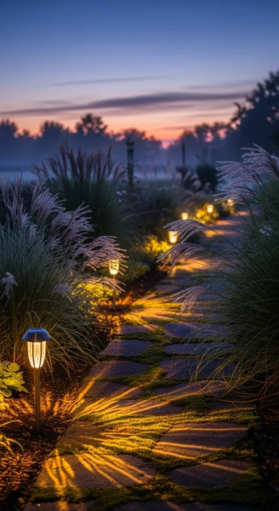 Lighting extends the garden’s charm into the night. Solar lights are easy to install—no wiring required. Line them along pathways or use spotlights to highlight trees or water features. The warm glow adds depth after sunset and keeps guests safe from tripping. It’s one of the simplest upgrades that instantly adds atmosphere.