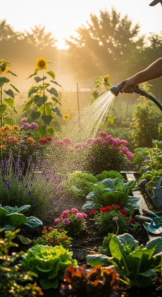 Morning watering helps roots absorb moisture before the day heats up. It also prevents fungus and mildew. Water slowly at the base of each plant, not the leaves. This encourages deep root growth and reduces waste.