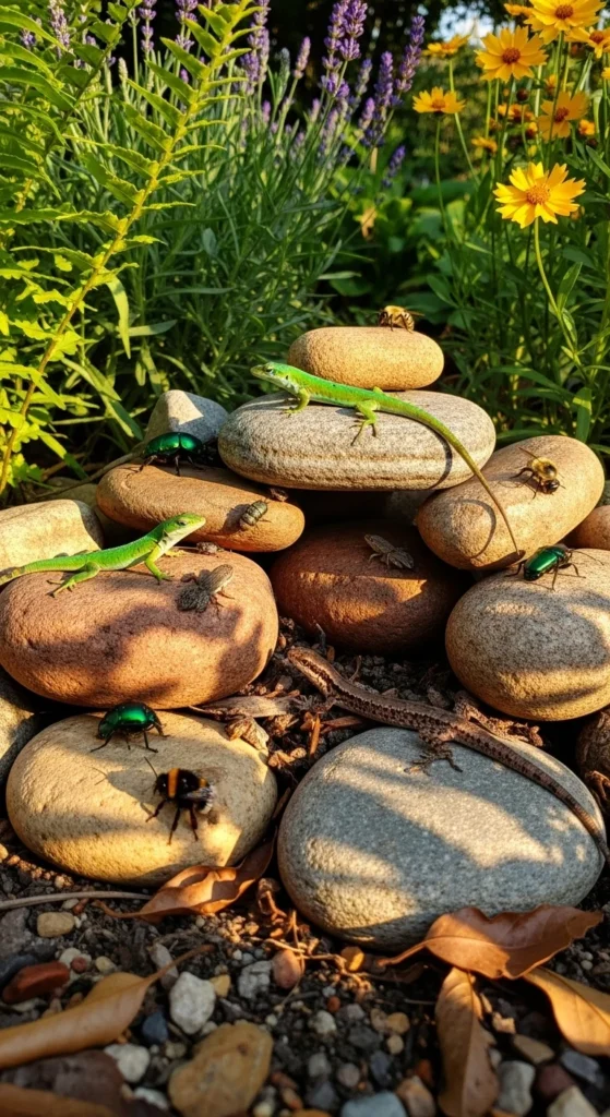 Stack rocks in a quiet spot to create hiding places for toads, lizards, and insects. Use different sizes for air gaps. Avoid cement—leave natural openings. Rock piles also store heat, providing warmth for cold-blooded creatures on chilly mornings.
