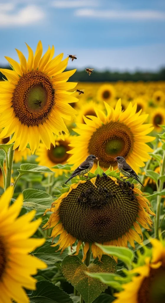 Sunflowers feed both bees and birds. Their nectar draws pollinators, and mature seeds feed finches and sparrows. Plant them in sunny spots with rich soil. Leave dried flower heads standing through fall for natural bird feeders.