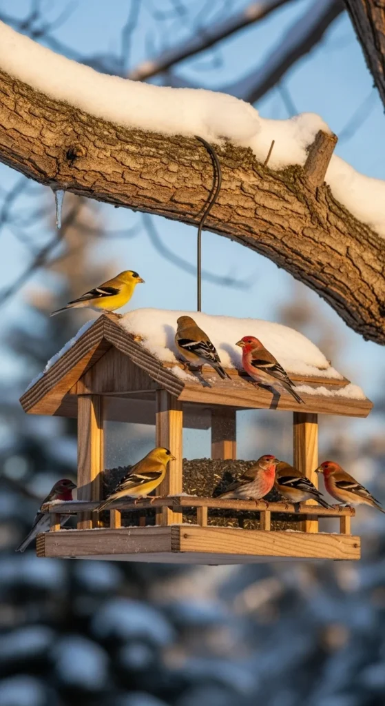 Bird feeders provide energy when food is scarce. Offer mixed seeds, suet, or sunflower hearts depending on the species in your area. Keep feeders clean to prevent disease. Place them near shrubs for quick shelter but away from windows to avoid collisions.