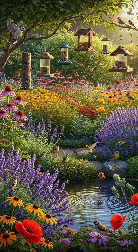 Native plants are the best food source for local pollinators. They’ve evolved to match the diets of native bees, butterflies, and birds. Choose wildflowers such as coneflowers, milkweed, or asters for your region. These require less watering and no chemical fertilizers. Group the same plants together so pollinators can easily find them.