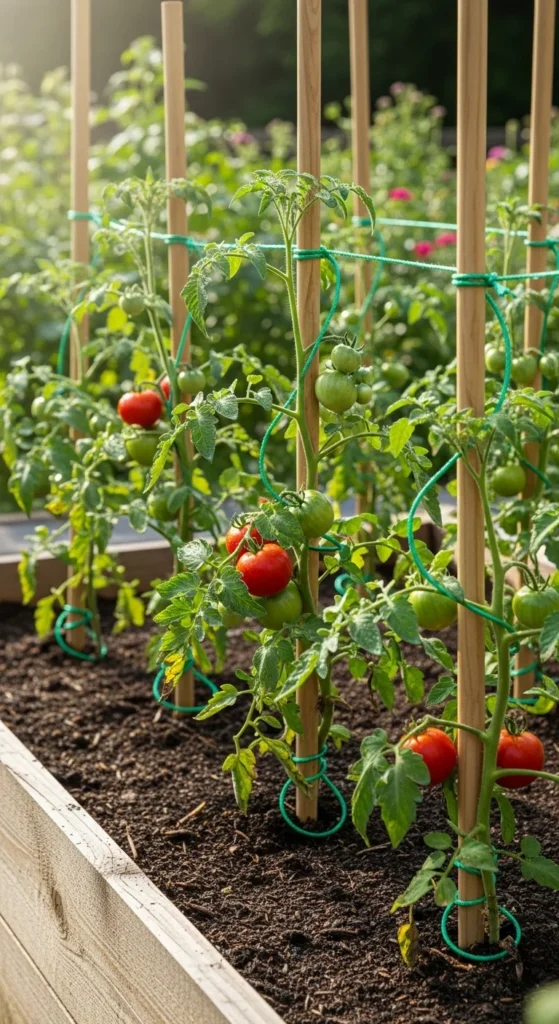 Use garden twine and stakes to support tall or climbing plants. Bamboo stakes or repurposed branches work fine. Tie loosely so stems can grow freely. This simple setup prevents broken stems and keeps your garden tidy.