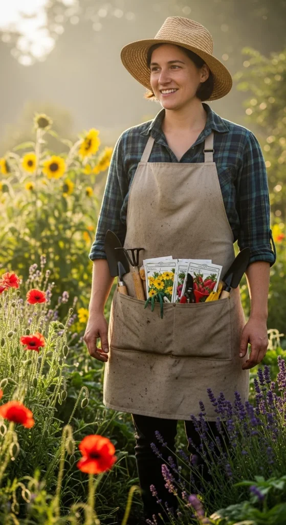 A garden apron keeps tools and gloves within reach. Choose one with deep pockets for pruners, twine, or seed packets. A waterproof canvas style holds up well and keeps your clothes clean.