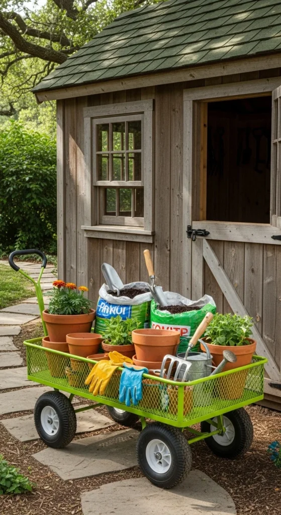 A garden cart moves heavier loads like mulch, compost, or large pots. It’s more stable than a wheelbarrow and perfect for flat areas. Look for foldable models if storage is tight.