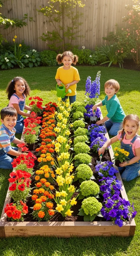 Kids love color! Plant flowers in rainbow order — think red tulips, orange marigolds, yellow sunflowers, green herbs, blue lobelia, and purple pansies. It’s a visual treat and helps children learn colors while tending the garden.