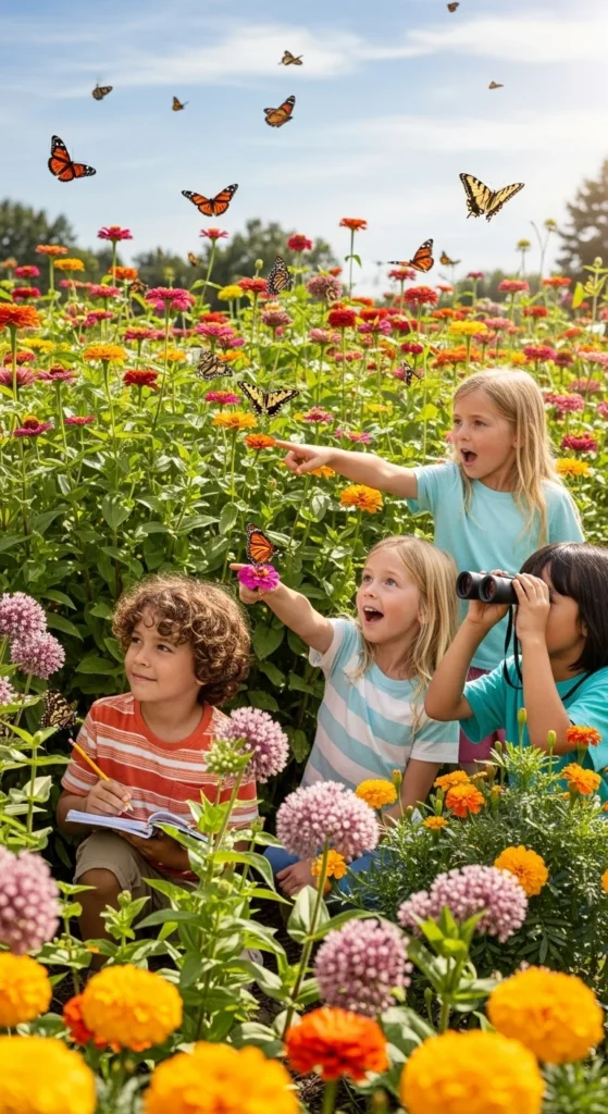 Choose nectar-rich plants that attract butterflies. Include milkweed to host monarch caterpillars. Kids can track how many butterflies visit each week.