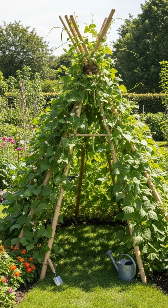 Use bamboo poles or sticks to build a teepee frame. Plant beans around the base. As they grow, vines create a shady hideaway — part garden, part fort.