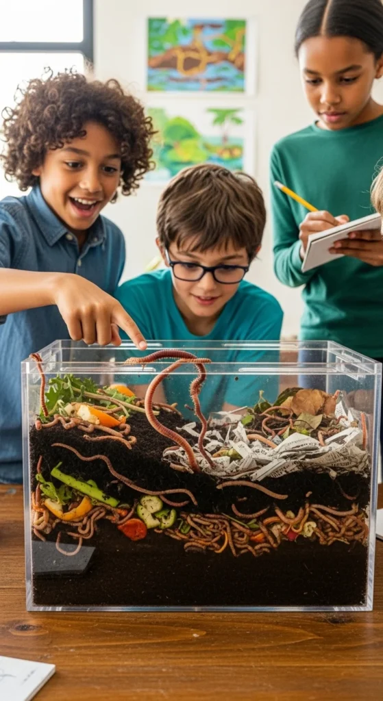 Teach kids about composting by building a worm farm. It’s a fascinating way to show how food scraps turn into rich garden soil.